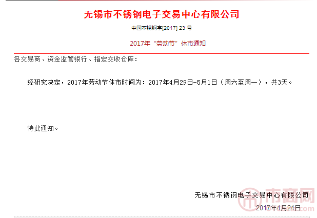 行業資訊 當前位置:首頁>>信息中心>>行業資訊 無錫市不銹鋼電子交易中心發布2017年“勞動節”休市通知 時間:2019-06-13 作者:無錫不銹鋼板 瀏覽:0 2017年4月24日無錫市不銹鋼電子交易中心官網發布2017年“勞動節”休市通知,4月29日至5月1日共3天休市。 原文如下: 2017年“勞動節”休市通知 上一篇:無錫漢能不銹鋼:4月27日無錫不銹鋼市場參考價 下一篇:2017年全球鎳需求料增至211萬噸
