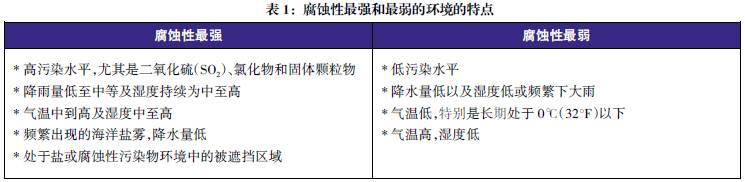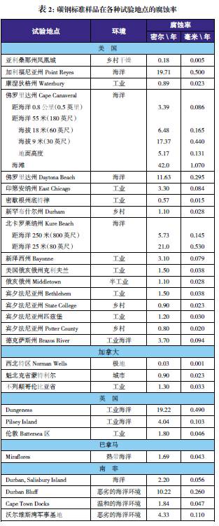 世界各地都進行過各種應用環(huán)境下的金屬腐蝕性能比較試驗。以碳鋼為標準樣品對這些試驗地點的腐蝕性進行了比較。表2給出了標準樣品在北美試驗地點的腐蝕率數(shù)據。盡管某些地點處于經常使用除冰鹽的地區(qū),但樣品并未暴露于除冰鹽之下。
