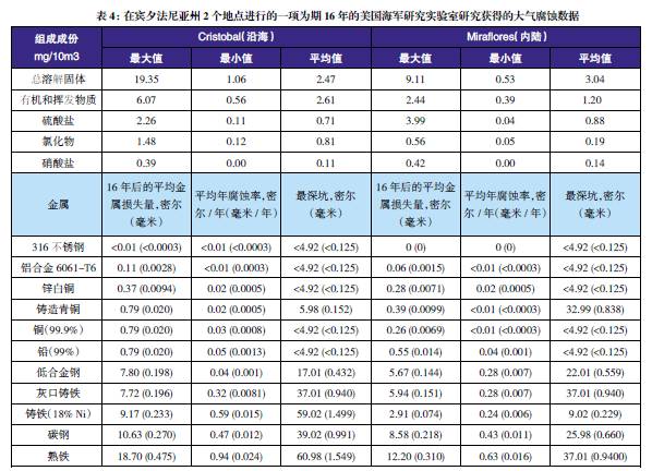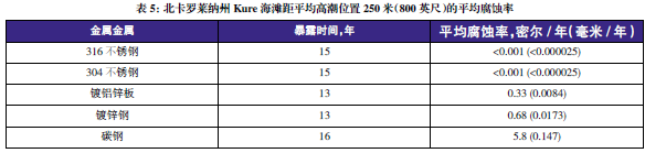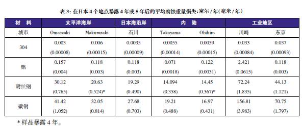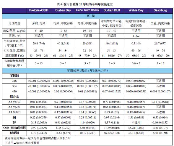 表3至表6的數(shù)據來自于日本、巴拿馬、Kure 海灘(北卡萊羅納州)和南非的試驗地點??衫眠@些數(shù)據在類似環(huán)境中選擇適當?shù)慕饘俨牧?,進行生命周期成本分析。