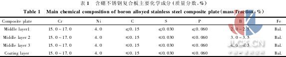 采用10kg真空熔煉爐在0.1kpa的真空條件下熔煉并澆鑄出3種不同硼含量的高硼不銹鋼芯料,將芯料置于澆鑄模內,從鑄模的上澆口中澆入作為覆層的普通不銹鋼,使之包覆在芯料周圍,制備出尺寸為120mm×100 mm×80mm,硼含量分別為2.0%~2. 5%、3.0%~3.5%、4.0%~4.5%的復合材料坯料。包覆澆鑄后的坯料在1150℃下經過鍛造及350型可逆熱軋機上的熱軋變形,軋制成最終厚度為3mm左右的不銹鋼復合板。軋制變形時,最初2道次的壓下量為20%~30%,使鑄態組織充分破碎,隨后壓下量降低至15%左右,每4~5個道次回爐重新加熱。