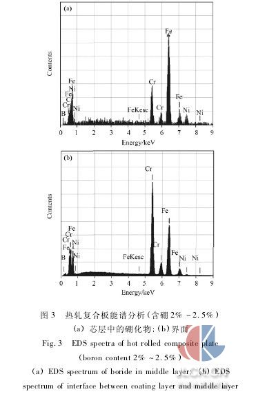 對熱軋后芯層中的硼化物及復合板界面處進行了eds分析,結果如圖3及表2所示。芯層中硼化物的b含量達到42.72%,原子分數達到79.23%,根據fe-b二元相圖[8],判斷該物相的成分中含有fe2b相。芯層中的硼化物除含有較多的fe 外,還含有一定量的cr、ni。cr元素由于是易形成碳化物的元素,而且具備生成cr-b化合物的熱力學條件,因此推斷該相中cr的存在形式有兩種: cr的碳化物和cr2b,綜上可知芯層塊狀硼化物的主要成分為: cr的碳化物,fe2b和cr2b。界面處硼含量較低,但cr含量較高,說明界面處的組織仍主要是α-fe基體相,但界面附近存在有少量由芯層越過界面擴散到覆層而形成的二次硼化物。