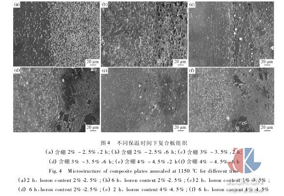 圖4為1150℃下,2、4、6h退火,高硼不銹鋼/普通不銹鋼復合板界面組織。從圖4中可看到,高溫下,由于界面兩側的整體硼含量差別較大,硼原子有將跨過界面向覆層擴散的趨勢。此時,擴散的主要驅動力應該是界面兩側奧氏體基體中硼原子濃度差引起的自由能梯度。但是,復合板是經過熱軋變形的,含硼不銹鋼芯層中的一部分硼原子已經擴散到了界面的另一側,因此,此時擴散的主要驅動力則是覆層普通不銹鋼基體在界面附近和遠離界面的區域硼原子的濃度差提供的。硼原子在基體中的溶解度非常低,而且覆層不銹鋼中的硼化物含量也極低,這就導致了硼原子在覆層中的擴散速率隨之降低[9]。