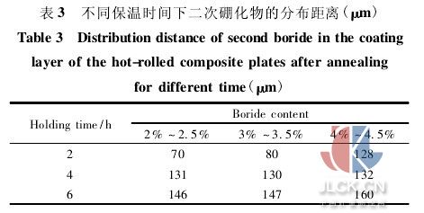 結合圖4、表3可以看出,隨著芯層硼含量的升高,同樣保溫時間下二次硼化物的分布距離增加,但這種變化的程度并不大。這是由于,一方面,隨著硼含量的增加,芯層中細小的共晶硼化物以及二次硼化物的數量是明顯增加的。這些硼化物可能隨著硼原子的擴散,部分溶解到基體中,因此有利于擴散的進行。另一方面,過共晶硼化物在保溫過程中基本不會出現局部向基體中溶解的過程。在硼原子從界面向覆層的擴散過程中,基本上不受到中間層組織中的過共晶硼化物的影響。所以,硼原子的擴散速率隨著中間層硼含量的增加而變化的程度不大。